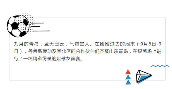 8日上午,在丹佛斯傳動(dòng)中國(guó)區(qū)副總裁盧中平和北區(qū)合作伙伴代表北京聯(lián)澤總經(jīng)理劉劍濤的致辭中,足球賽拉開(kāi)了帷幕!本次足球賽本著“友誼第一”的原則,為大家提供了一個(gè)既可以感受足球魅力,又可以相互交流的平臺(tái)。并以此為契機(jī),激發(fā)熱情,強(qiáng)健體魄,凝聚力量!